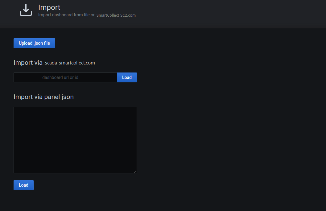 From here you can upload a dashboard JSON file, paste a DranSCADA.com dashboard URL or paste dashboard JSON text directly into the text area.